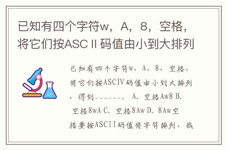 已知有四个字符w,A,8,空格,将它们按ASCⅡ码值由小到大排列,得到______。 A. 空格Aw8 B. 空格8wA C. 空格8Aw D. 8Aw空格