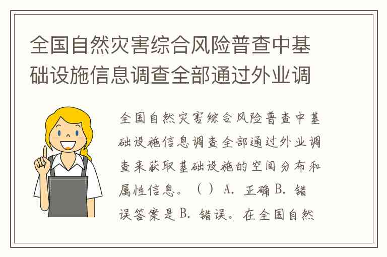 在全国自然灾害综合风险普查中,基础设施信息的获取并不仅限于外业调查。通常,空间分布和属性信息的获取可能会结合外业调查与遥感技术、卫星影像、地图数据、现有基础设施档案等多种方式。因此,单纯依赖外业调查来获取这些信息并不完全准确。