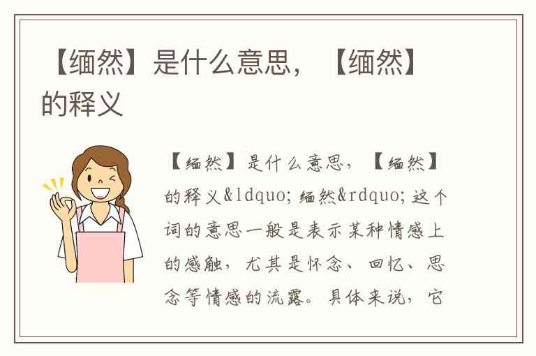 “缅然”这个词的意思一般是表示某种情感上的感触,尤其是怀念、回忆、思念等情感的流露。具体来说,它常用来形容一种带有淡淡哀愁、柔和的情感状态,尤其是指对过去、某个人、或某种事情的怀念或追忆。