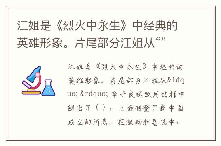 江姐是《烈火中永生》中经典的英雄形象。片尾部分江姐从“”华子良送饭用的桶中刨出了(),上面刊登了新中国成立的消息。在激动和喜悦中,江姐和同的战友们亲手绘制了,准备越狱时带上它,一同庆祝新中国的诞生。