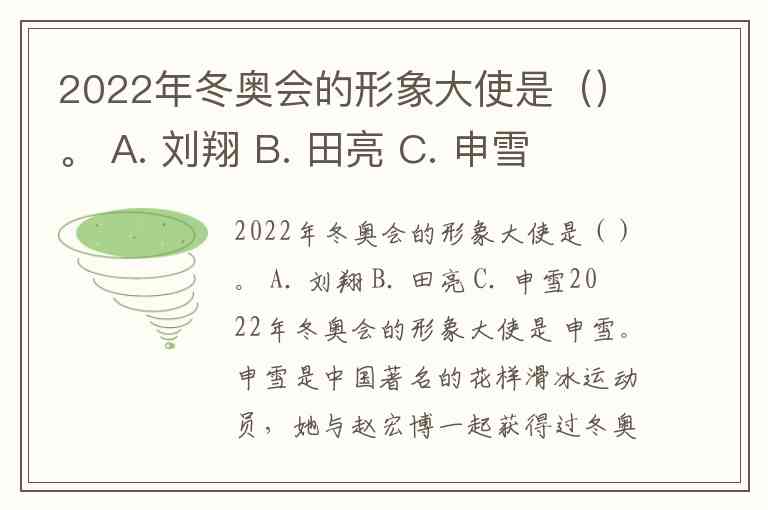 2022年冬奥会的形象大使是()。 A. 刘翔 B. 田亮 C. 申雪