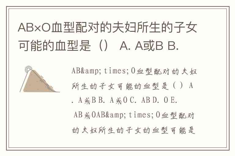 AB×O血型配对的夫妇所生的子女可能的血型是() A. A或B B. A或O C. AB D. O E. AB或O