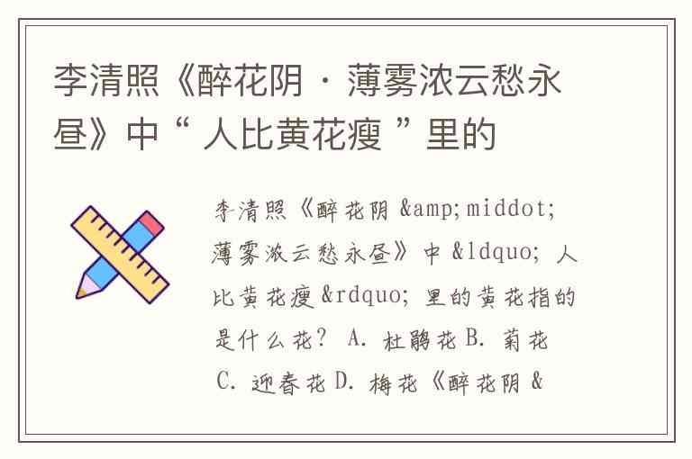 李清照《醉花阴 · 薄雾浓云愁永昼》中 “ 人比黄花瘦 ” 里的黄花指的是什么花? A. 杜鹃花 B. 菊花 C. 迎春花 D. 梅花