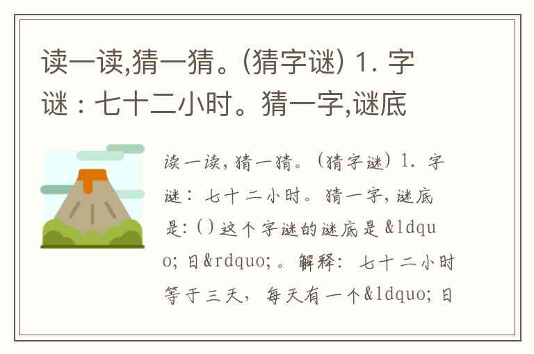 读一读,猜一猜。(猜字谜) 1. 字谜 : 七十二小时。猜一字,谜底是:( )