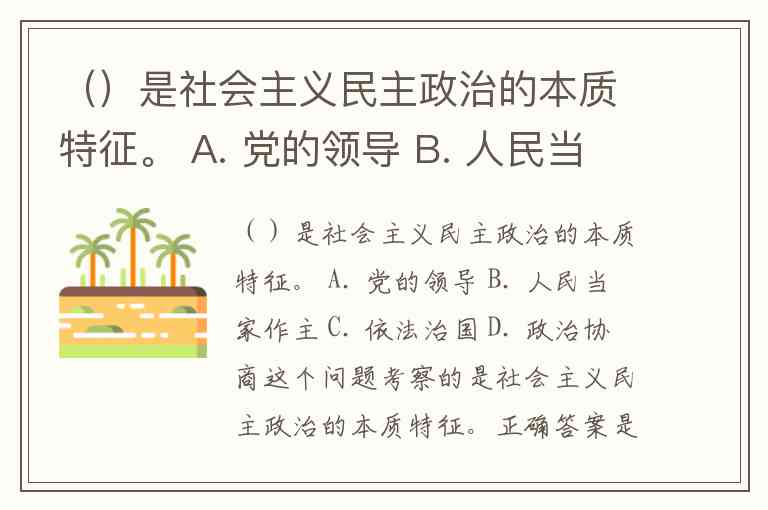 ()是社会主义民主政治的本质特征。 A. 党的领导 B. 人民当家作主 C. 依法治国 D. 政治协商