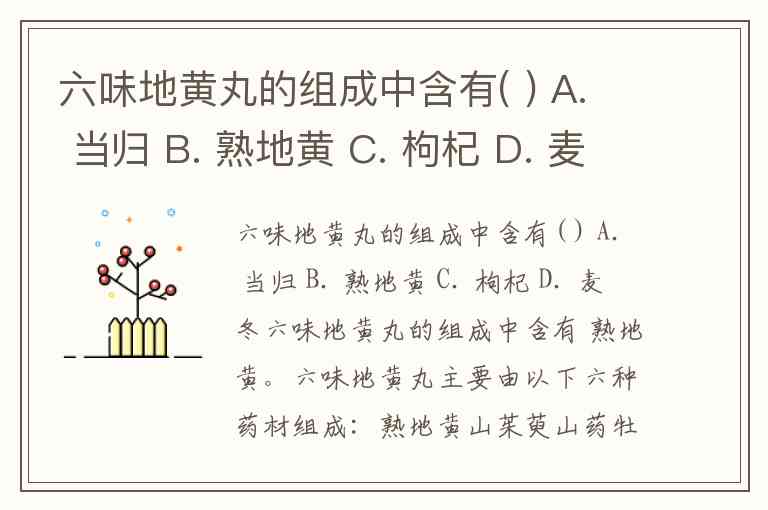 六味地黄丸的组成中含有( ) A. 当归 B. 熟地黄 C. 枸杞 D. 麦冬