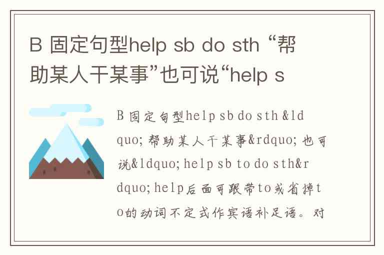 B 固定句型help sb do sth “帮助某人干某事”也可说“help sb to do sth”help后面可跟带to或省掉to的动词不定式作宾语补足语。