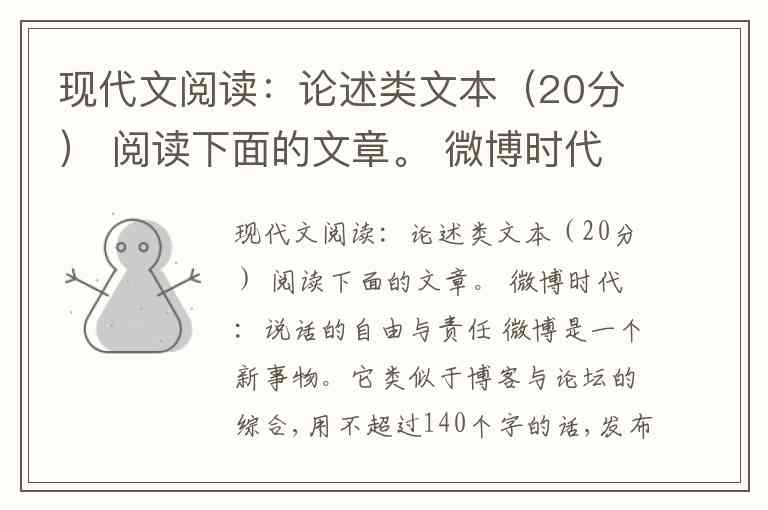 现代文阅读:论述类文本(20分) 阅读下面的文章。 微博时代:说话的自由与责任 微博是一个新事物。它类似于博客与论坛的综合,用不超过140个字的话,发布信息,即时互动。相对于传统媒介,它的信息传播更为快捷和简单。一条信息可以在几秒钟内传播开去,让人们感到身处信息现场,可以及时地把自己的想法用最快的速度传递出去。在这个空间里,所有人都可以平等的、相同的地位和身份发布言论,从而形成了一个容量巨大的公共话语空间。 微博门槛低,发布信息快,人人都可以过一把做记者的瘾,如同每个人都可以采访与发言。它不需要渊博的学识和技术的修炼。似乎不费时,不费力,就可以随时随地将自己的所见所闻所感发出去,也可以随时随地参与讨论他人的所见所闻所感。民意民智有了新的“翅膀”,从对各种交通肇事事件的关注,到对地动仪的争论,再到警察“微博缉凶”,冷不防,我们这个时代,已经由论坛时代、博客时代升级到微 博时代了。 事实上,微博是一把“双刃剑”。它的字数少信息量大,消息发布之容易到了只需要点击一个“转发”键。操作的便捷,简化了思考,也容易引发人们的跟随效应。在“生产”信息的过程中,也会制造出懒于识别、快速再转发的信息“媒子”,甚至有人捏造信息,制造“兴奋点”,博取人们眼球,引起更多关注,实现商业利益或者其他不可告人的目的。信息变得丰富了,也更加杂乱、泡沫化了,甚至是哗众取宠!无论是金庸“被去世”的假新闻,还是名人“骂战”此起彼伏的喧哗,在良莠不齐的芜杂背后,不乏泄愤谩骂的胡言乱语。在“微博”这个水塘里,也有泥沙和浑浊不清的脏水…… 中国的现实社会发展变化快,网络世界也远未成熟。微博让现实与网络有了更加亲密而闪电式的接触,有了表达的自由,它同时也需要建构道德与责任。当我们希望自由而丰富地表达自己的意见和感受时,也需要维护和坚守社会的道德和责任。现代的中国已经走出了传统的中庸与中和,而趋于偏激与对立,做事与想问题常执于一端,这需要我们重新检讨和反思。 表达的自由也同时需要承担表达的责任。微博世界 并不是私人世界,而是一个更加隐形而复杂的虚拟社会。人们总希望微博能产生更大的社会影响,能尽快地从虚拟世界进入现实社会。一方面,汹涌的网络民意,通过虚拟的力量,冲击着种种现实弊端,促使当事人不得不出来面对公众承担责任,另一方面,表达者也应该坚守和维护社会的责任。表面上,微博是“微”,是你个人的“麦克风”,但众多粉丝和听众却是社会人,你说的话虽不一定是人命关天、财产万千,却应有是非曲直、善恶正邪。 王本朝《光明日报》(2011年2月28日) 小题1:为什么说“微博是一把‘双刃剑’”?(6分) 小题2:“在‘微博’这个水塘里,也有泥沙和浑浊不清的脏水”这句话有什么含义?(8分) 小题3:微博时代说话的“责任”有哪些具体内容?(6分)