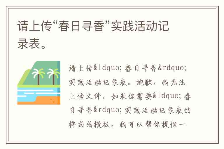 抱歉,我无法上传文件。如果你需要“春日寻香”实践活动记录表的样式或模板,我可以帮你提供一个示例,或者指导你如何制作它。你需要哪个呢?