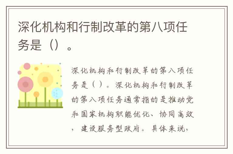 深化机构和行制改革的第八项任务通常指的是推动党和国家机构职能优化、协同高效,建设服务型政府。具体来说,这项任务的核心是要强化政府职能的科学配置,推动行政职能与服务功能的整合与优化,减少不必要的行政干预,提高政府工作效率。