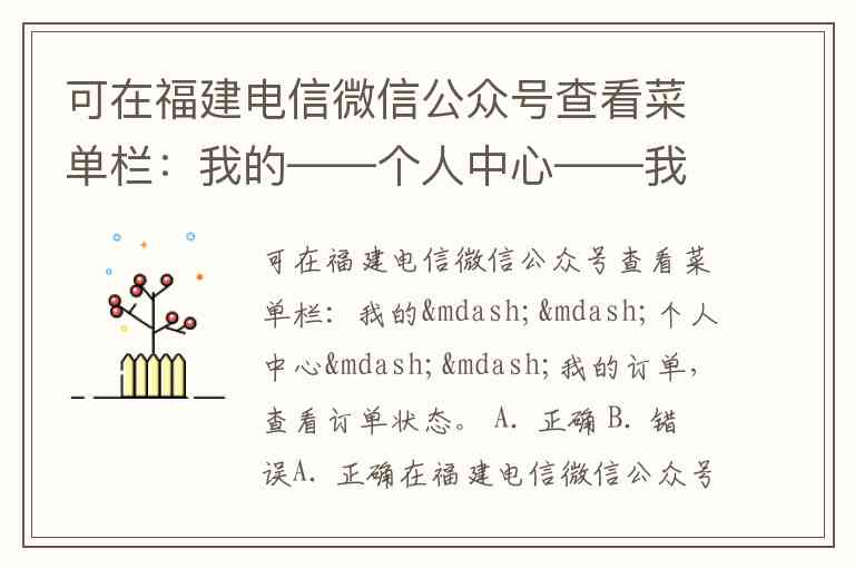可在福建电信微信公众号查看菜单栏:我的——个人中心——我的订单,查看订单状态。 A. 正确 B. 错误