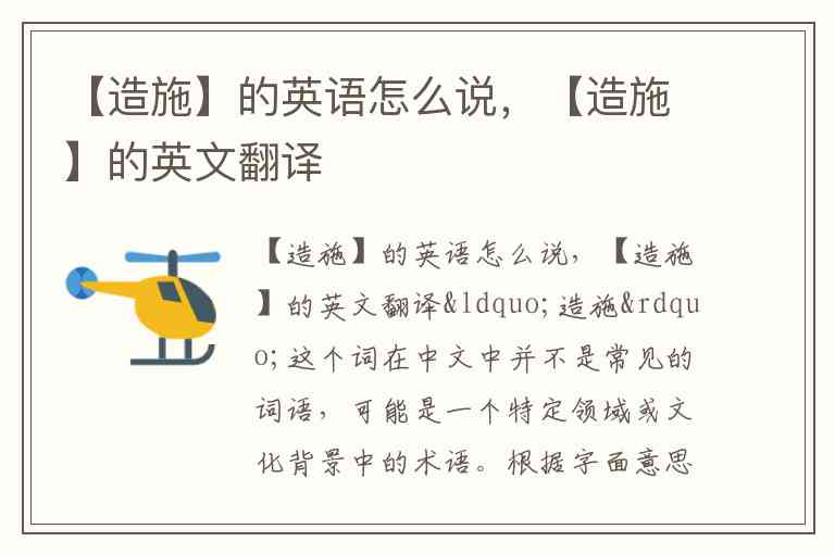 “造施”这个词在中文中并不是常见的词语,可能是一个特定领域或文化背景中的术语。根据字面意思,它可能是指“制造”和“施行”某种行为或行为的过程。如果是指某种行为或操作的实施,可以翻译成 "manufacture and implement" 或 "create and execute"。