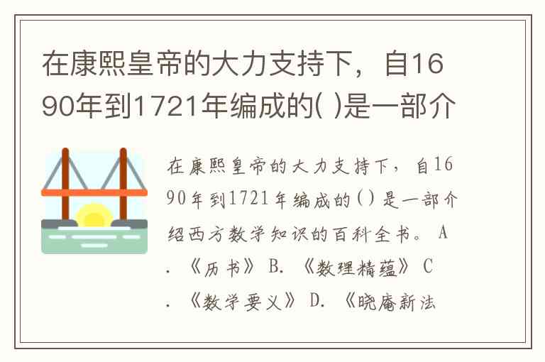 在康熙皇帝的大力支持下,自1690年到1721年编成的( )是一部介绍西方数学知识的百科全书。 A. 《历书》 B. 《数理精蕴》 C. 《数学要义》 D. 《晓庵新法》