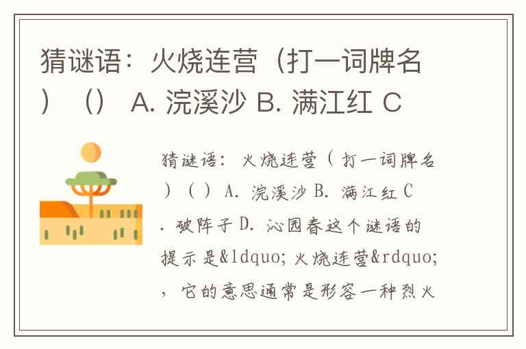 猜谜语:火烧连营(打一词牌名)() A. 浣溪沙 B. 满江红 C. 破阵子 D. 沁园春