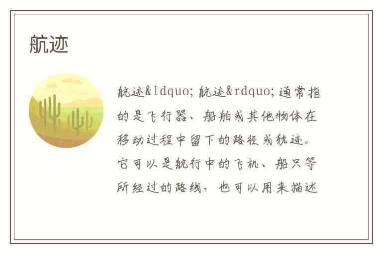 “航迹”通常指的是飞行器、船舶或其他物体在移动过程中留下的路径或轨迹。它可以是航行中的飞机、船只等所经过的路线,也可以用来描述卫星、导弹等物体的轨迹。根据具体场景,航迹可以包括位置、速度、方向等信息。
