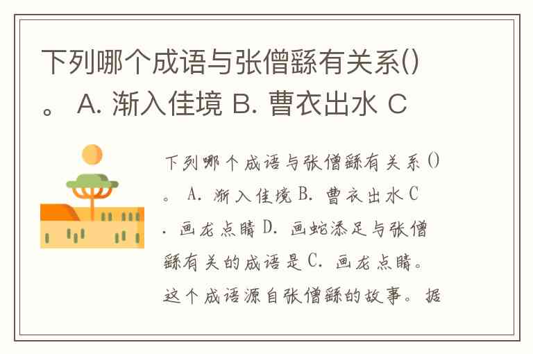 下列哪个成语与张僧繇有关系()。 A. 渐入佳境 B. 曹衣出水 C. 画龙点睛 D. 画蛇添足