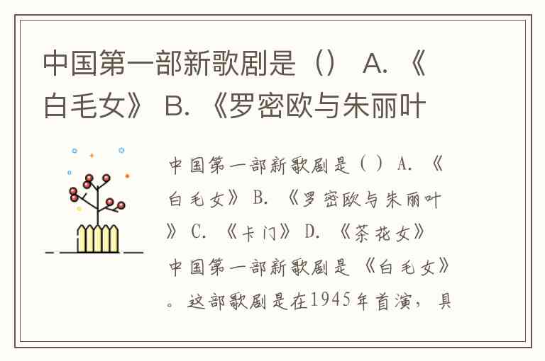 中国第一部新歌剧是() A. 《白毛女》 B. 《罗密欧与朱丽叶》 C. 《卡门》 D. 《茶花女》