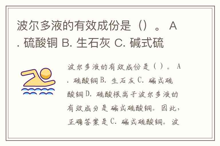波尔多液的有效成份是()。 A. 硫酸铜 B. 生石灰 C. 碱式硫酸铜 D. 硫酸根离子