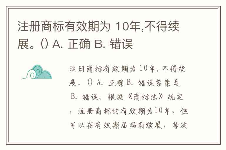 注册商标有效期为 10年,不得续展。() A. 正确 B. 错误