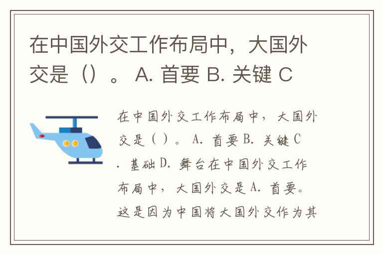 在中国外交工作布局中,大国外交是()。 A. 首要 B. 关键 C. 基础 D. 舞台
