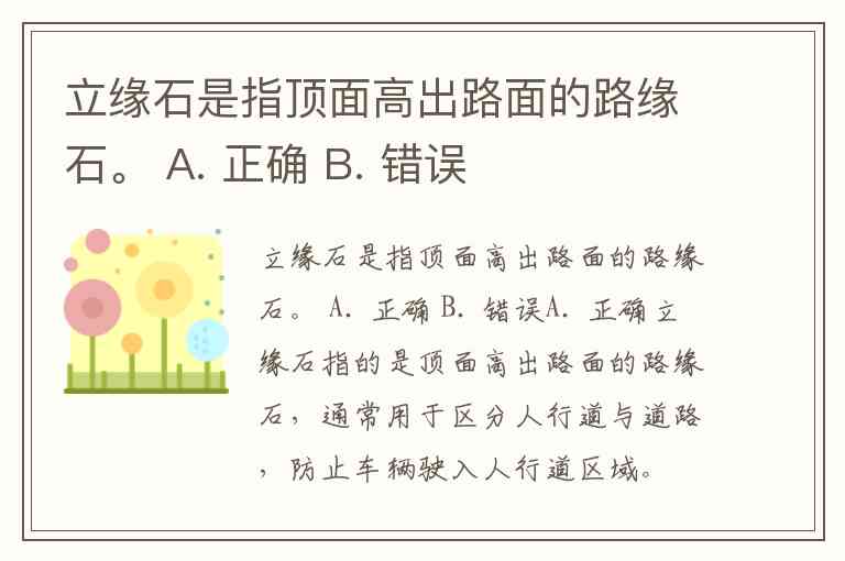 立缘石指的是顶面高出路面的路缘石,通常用于区分人行道与道路,防止车辆驶入人行道区域。