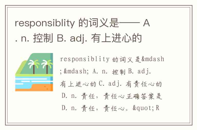 responsiblity 的词义是—— A. n. 控制 B. adj. 有上进心的 C. adj. 有责任心的 D. n. 责任,责任心