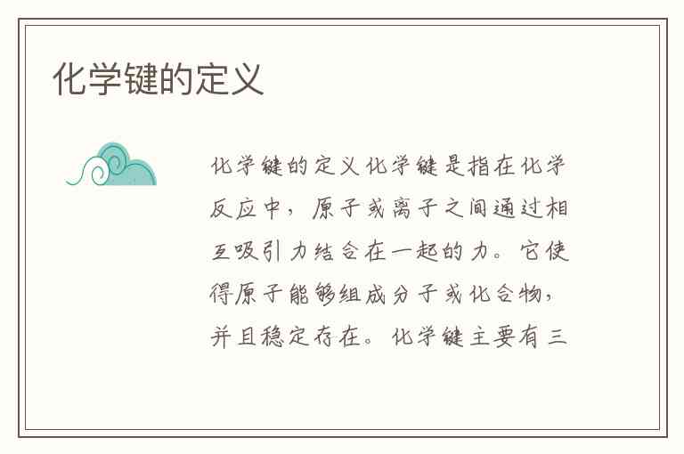 化学键是指在化学反应中,原子或离子之间通过相互吸引力结合在一起的力。它使得原子能够组成分子或化合物,并且稳定存在。化学键主要有三种类型: