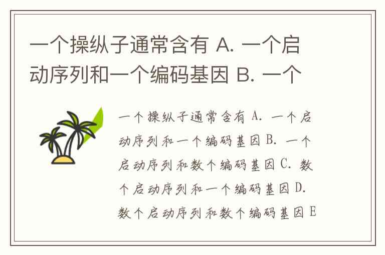 一个操纵子通常含有 A. 一个启动序列和一个编码基因 B. 一个启动序列和数个编码基因 C. 数个启动序列和一个编码基因 D. 数个启动序列和数个编码基因 E. 两个启动序列和数个编码基因
