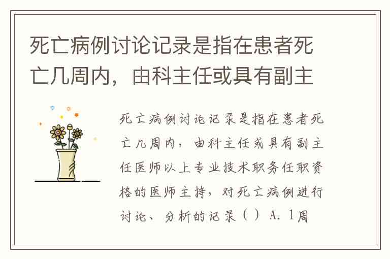 死亡病例讨论记录是指在患者死亡几周内,由科主任或具有副主任医师以上专业技术职务任职资格的医师主持,对死亡病例进行讨论、分析的记录() A. 1周 B. 2周 C. 3周 D. 4周 E. 6周