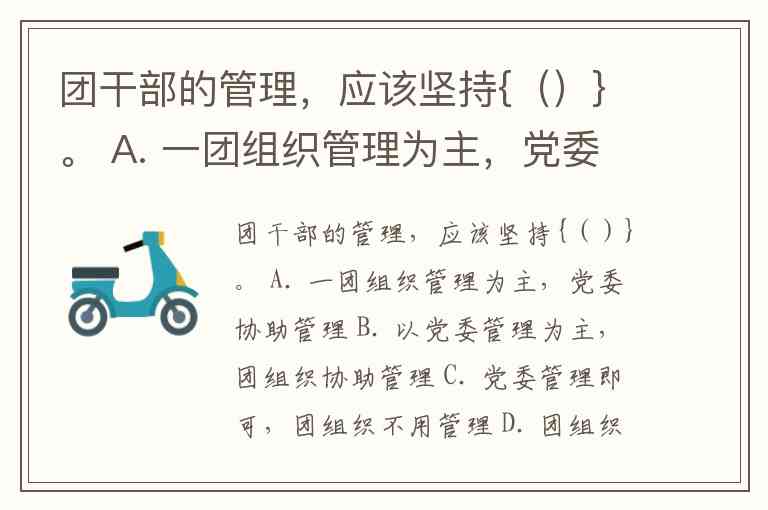 团干部的管理,应该坚持{()}。 A. 一团组织管理为主,党委协助管理 B. 以党委管理为主,团组织协助管理 C. 党委管理即可,团组织不用管理 D. 团组织管理即可,党委不用管理