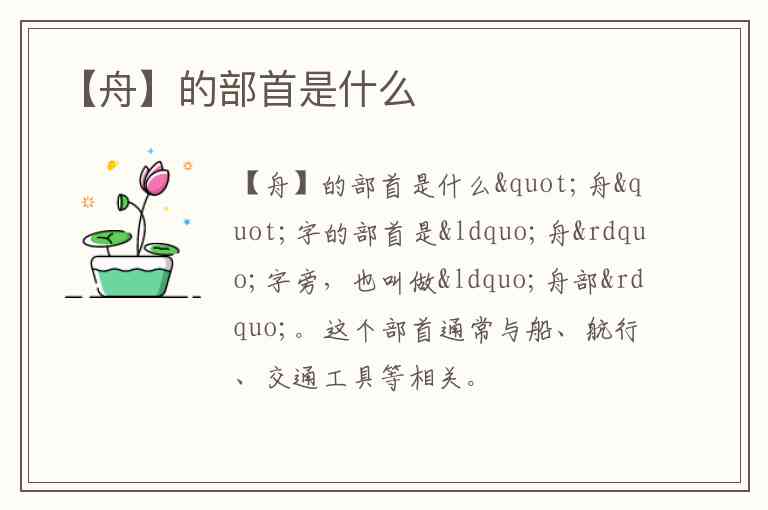 "舟"字的部首是“舟”字旁,也叫做“舟部”。这个部首通常与船、航行、交通工具等相关。
