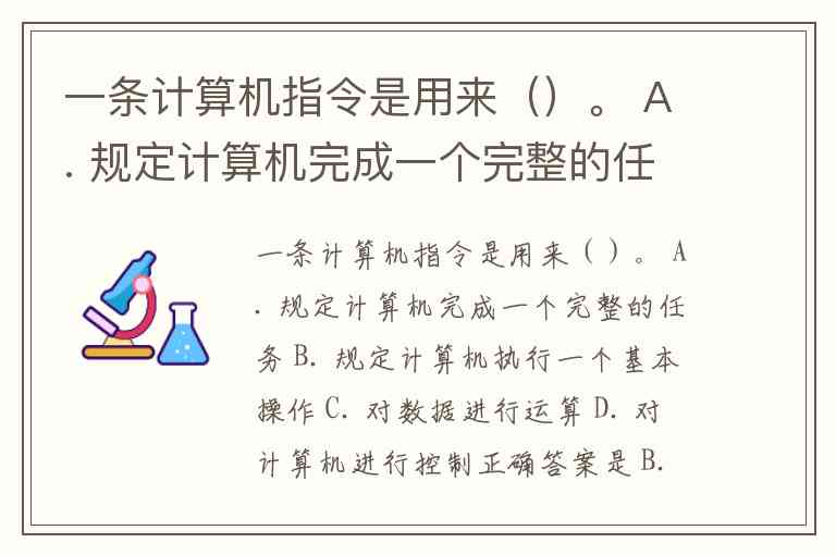 一条计算机指令是用来()。 A. 规定计算机完成一个完整的任务 B. 规定计算机执行一个基本操作 C. 对数据进行运算 D. 对计算机进行控制