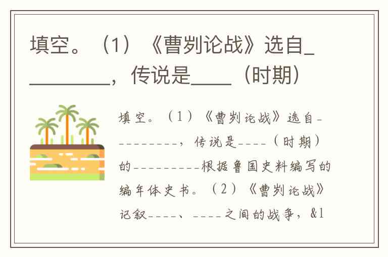 填空。(1)《曹刿论战》选自_________,传说是____(时期)的_________根据鲁国史料编写的编年体史书。(2)《曹刿论战》记叙____、____之间的战争,“_________”是历史上以弱胜强的著名战例之一。(3)按原文填写。①____________。可以一战。战则请从。②_____________,_____________。一鼓怍气,再而衰,三而竭。彼竭我盈,故克之。
