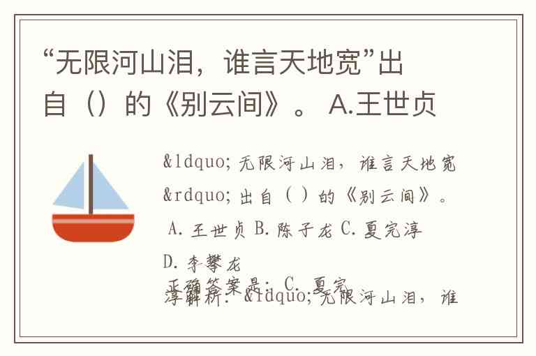 “无限河山泪,谁言天地宽”出自明末少年民族英雄、诗人夏完淳的《别云间》。这是他在抗清失败被俘后,押解离乡前所作的一首悲壮诗篇,充满了国仇家恨与壮志未酬的悲愤。
