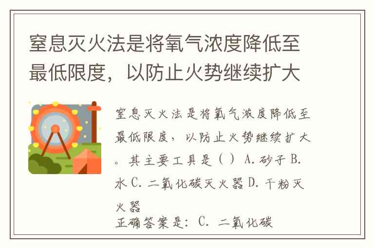 窒息灭火法是将氧气浓度降低至最低限度,以防止火势继续扩大。其主要工具是() A.砂子 B.水 C.二氧化碳灭火器 D.干粉灭火器