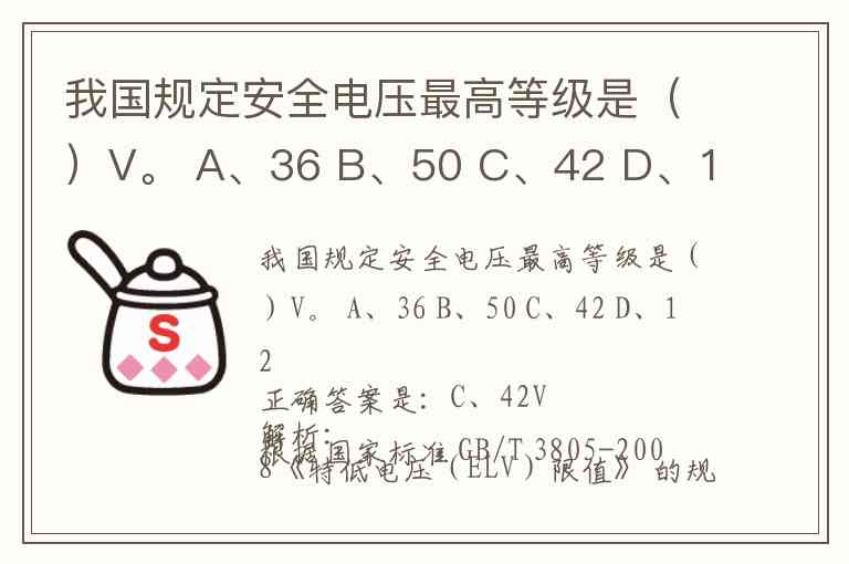 我国规定安全电压最高等级是()V。 A、36 B、50 C、42 D、12