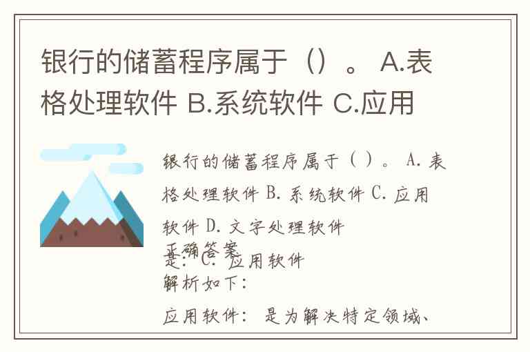 结论: 银行的储蓄程序是为了解决银行业务这一特定应用需求而设计的,因此它属于应用软件。