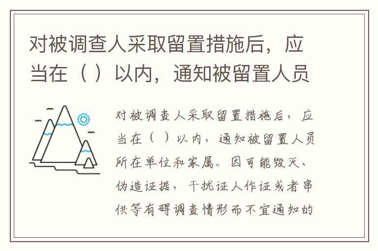 对被调查人采取留置措施后,应当在( )以内,通知被留置人员所在单位和家属。因可能毁灭、伪造证据,干扰证人作证或者串供等有碍调查情形而不宜通知的,应当按规定报批,记录在案。有碍调查的情形消失后,应当立即通知被留置人员所在单位和家属。 A. 四十八小时 B. 六小时 C. 十二小时 D. 二十四小时