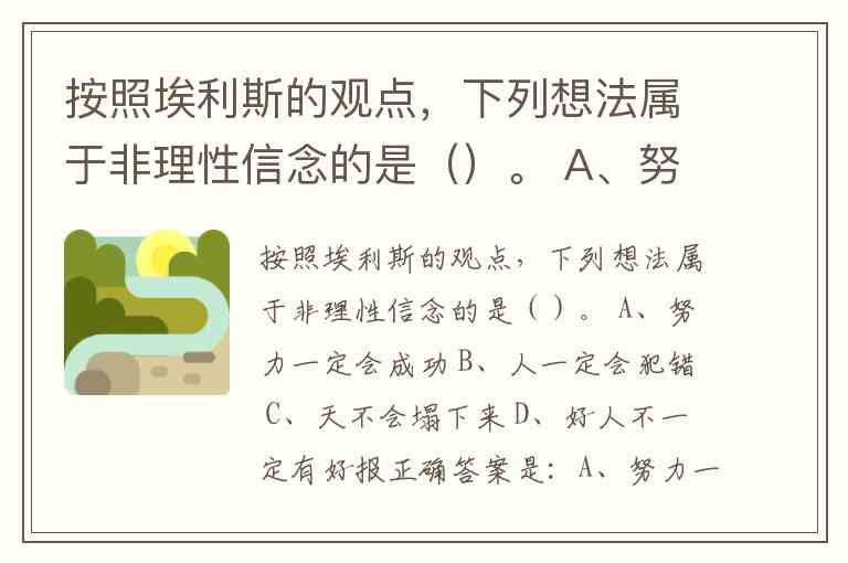 埃利斯认为,使人产生情绪困扰的不是事件本身,而是人们对事件的不合理、非理性的信念。这些非理性信念通常具有绝对化、过分概括化、糟糕至极等特点。