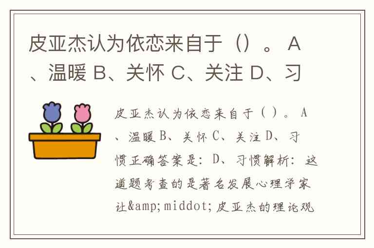 皮亚杰从一个认知建构的视角出发,认为依恋是婴儿通过反复接触和互动,对其主要照料者形成的一种认知习惯。因此,在他的理论框架下,依恋来自于 D、习惯。