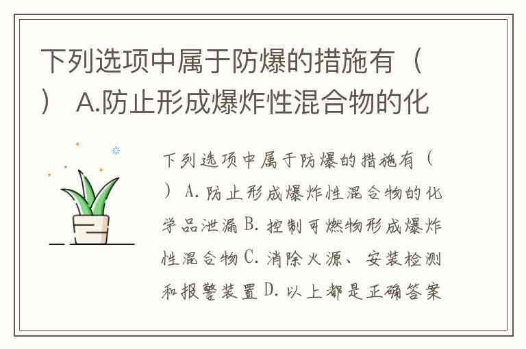 A. 防止形成爆炸性混合物的化学品泄漏:这是从源头控制的角度出发,通过良好的工艺设计、设备密封和维护,防止可燃物质泄漏到环境中,从而从根本上避免形成爆炸性环境。