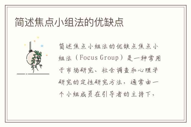 总结来说,焦点小组法是一个非常有效的定性研究工具,但其结果的解释需要谨慎,并且通常需要结合其他定量研究方法来增加研究的可靠性和全面性。