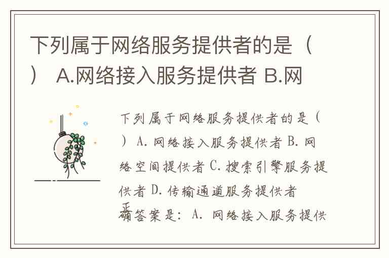 下列属于网络服务提供者的是() A.网络接入服务提供者 B.网络空间提供者 C.搜索引擎服务提供者 D.传输通道服务提供者