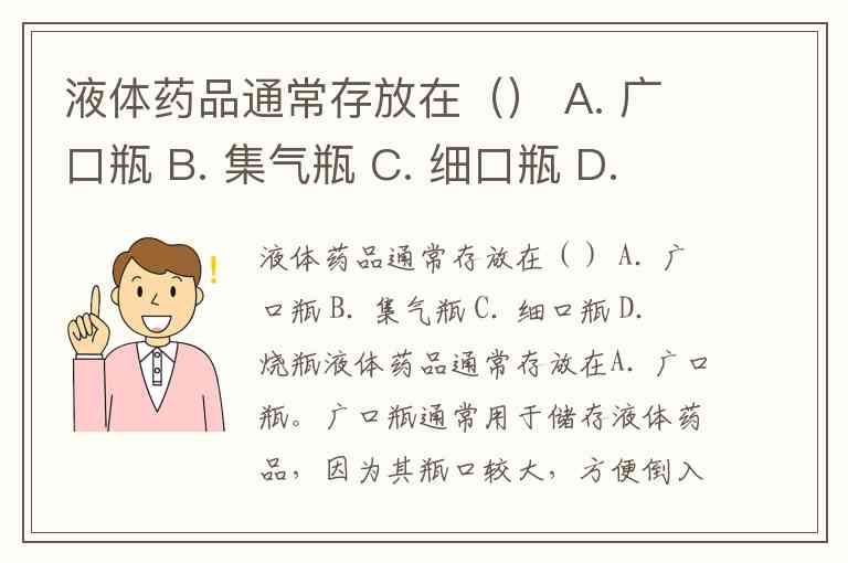 广口瓶通常用于储存液体药品,因为其瓶口较大,方便倒入和取出液体。同时,广口瓶的设计也能更好地容纳液体和气体的交换,有助于液体药品的存放。