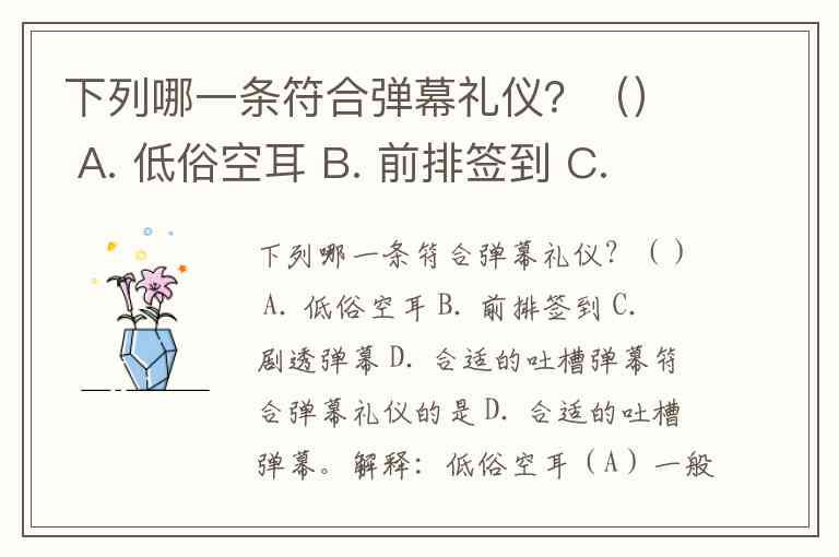 下列哪一条符合弹幕礼仪?() A. 低俗空耳 B. 前排签到 C. 剧透弹幕 D. 合适的吐槽弹幕