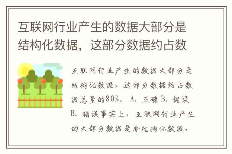 互联网行业产生的数据大部分是结构化数据,这部分数据约占数据总量的80%。 A. 正确 B. 错误