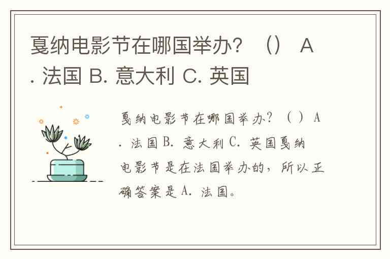 戛纳电影节在哪国举办?() A. 法国 B. 意大利 C. 英国