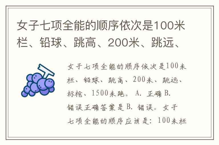 女子七项全能的顺序依次是100米栏、铅球、跳高、200米、跳远、标枪、1500米跑。 A. 正确 B. 错误