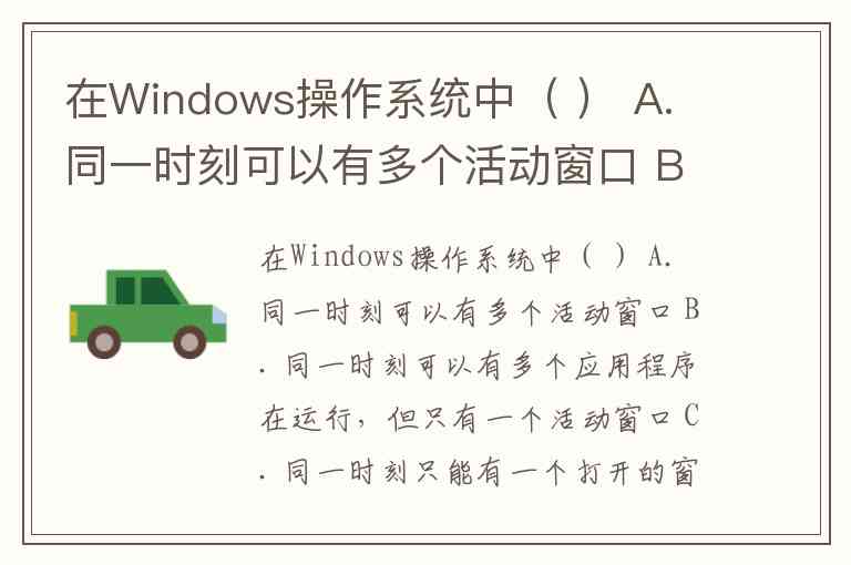 在Windows操作系统中( ) A. 同一时刻可以有多个活动窗口 B. 同一时刻可以有多个应用程序在运行,但只有一个活动窗口 C. 同一时刻只能有一个打开的窗口 D. DOS应用程序窗口与Windows应用程序窗口不能同时打开着