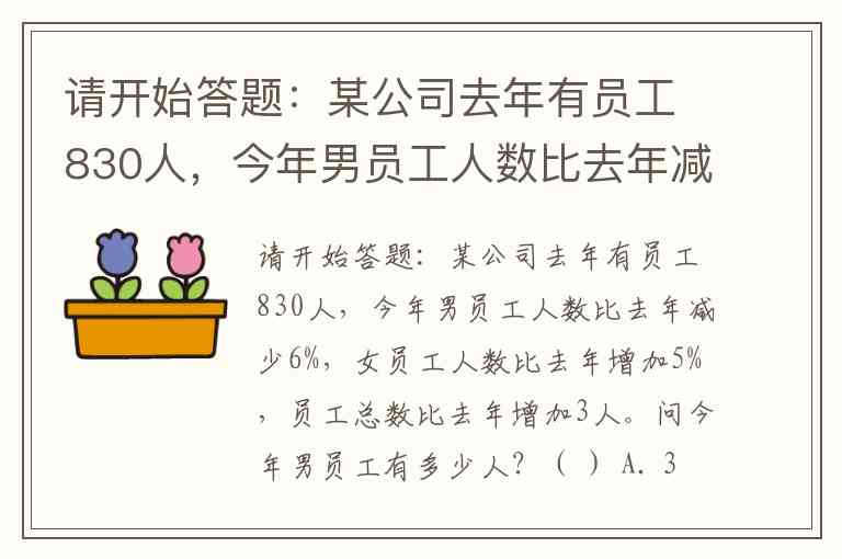 请开始答题:某公司去年有员工830人,今年男员工人数比去年减少6%,女员工人数比去年增加5%,员工总数比去年增加3人。问今年男员工有多少人?( ) A. 329 B. 350 C. 371 D. 504